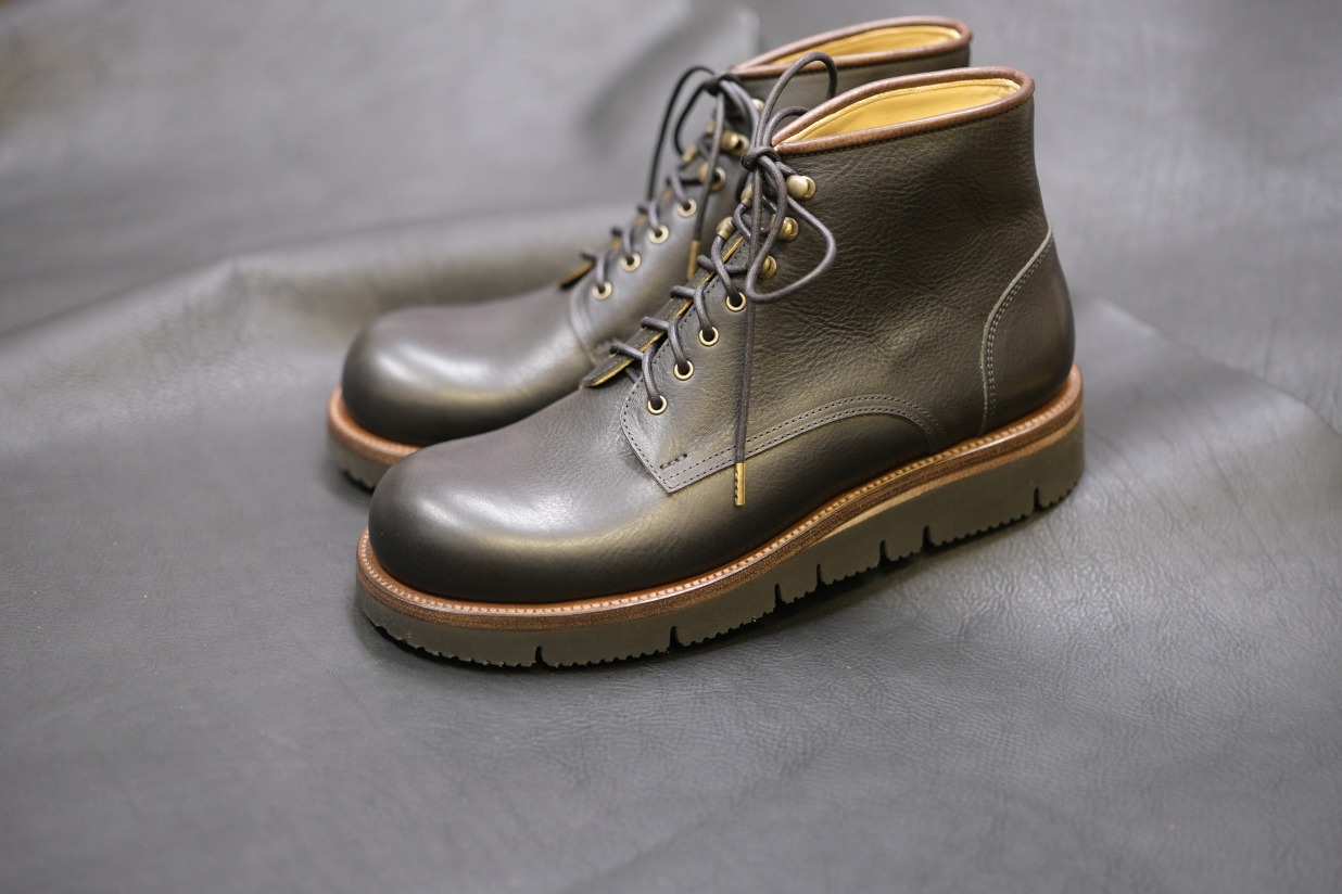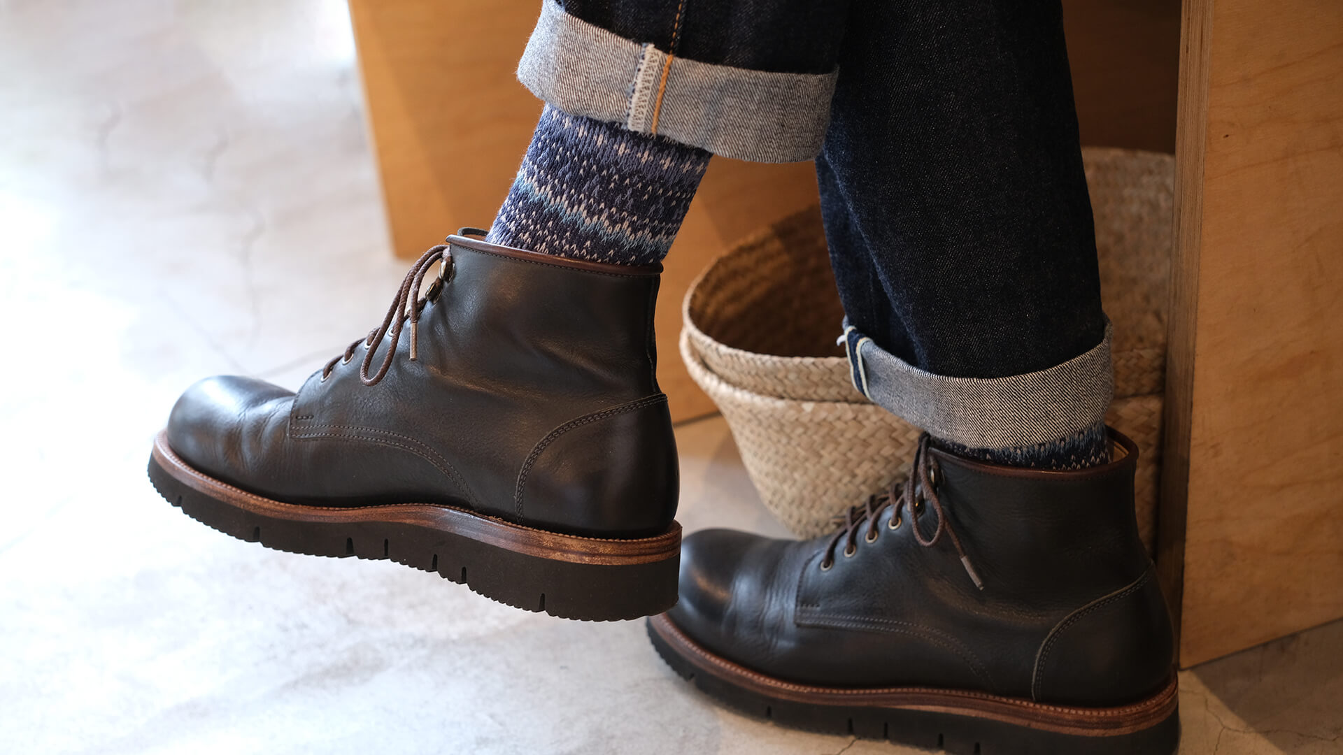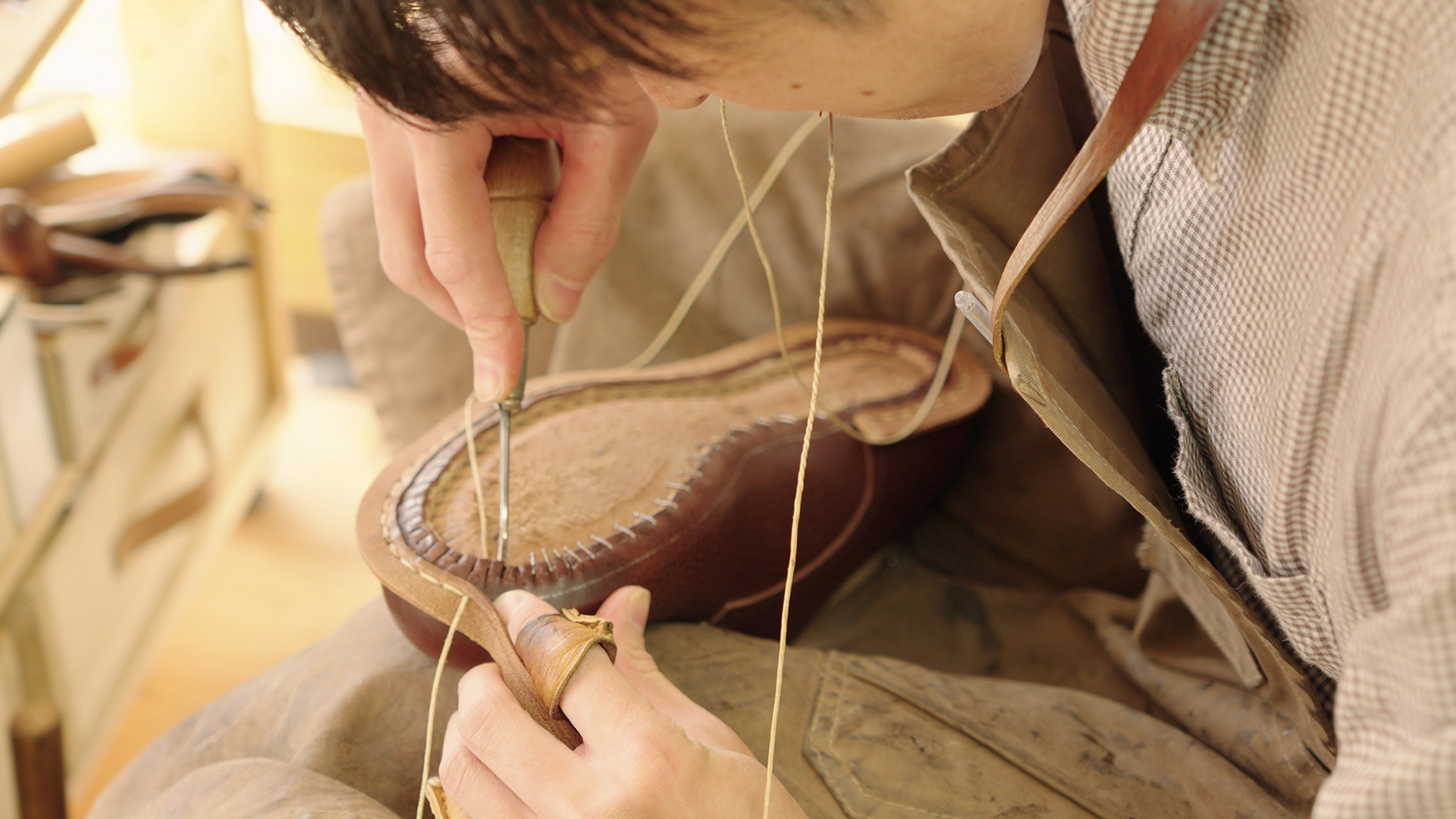 荒川区の工房で、一針一針心を込めて靴作りを行っています。日本人の足に合わせた木型と、手作業ならではの立体的な成形により、包み込まれるようなフィット感を実現。修理しながら長く愛せる一足です。