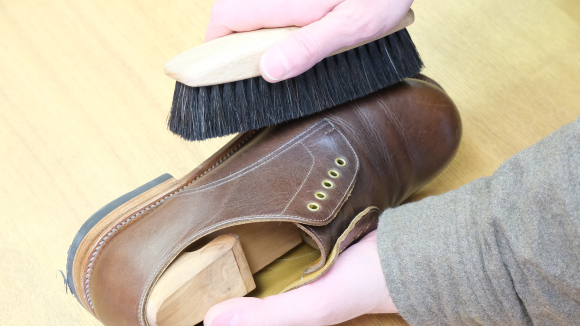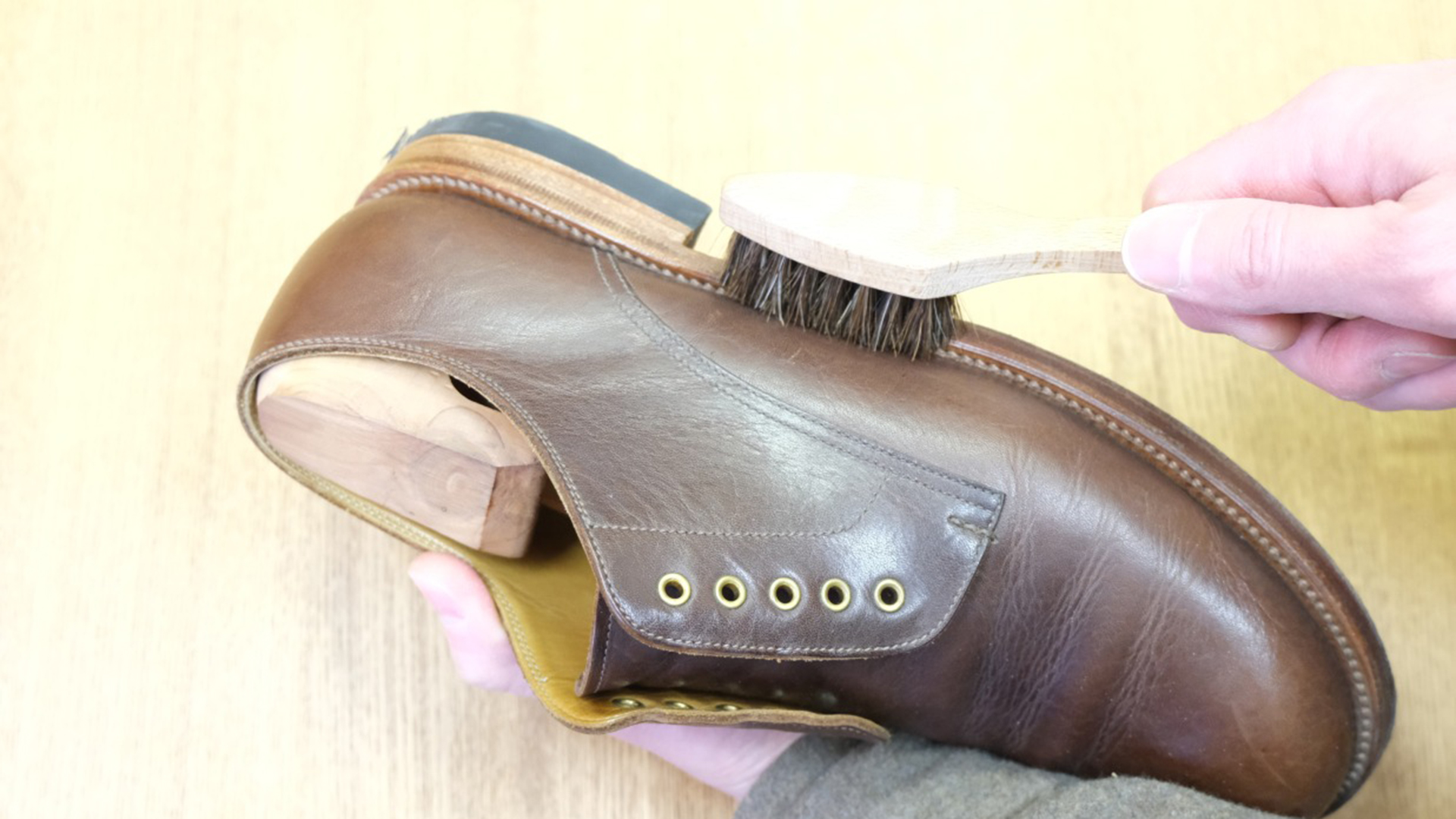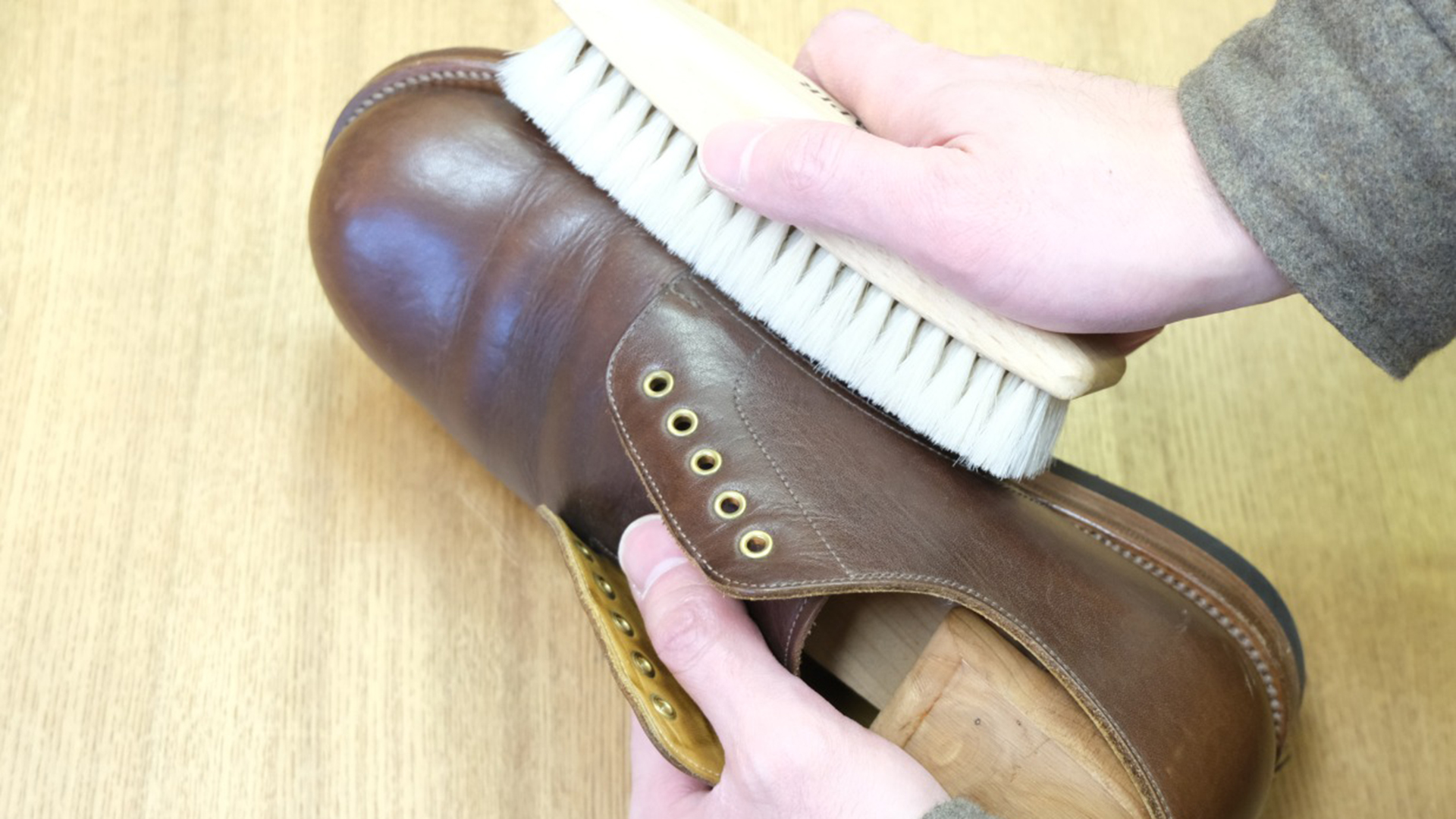 山羊毛の艶出しブラシで靴全体を優しく磨いていきます。毛先で磨くようなイメージです。