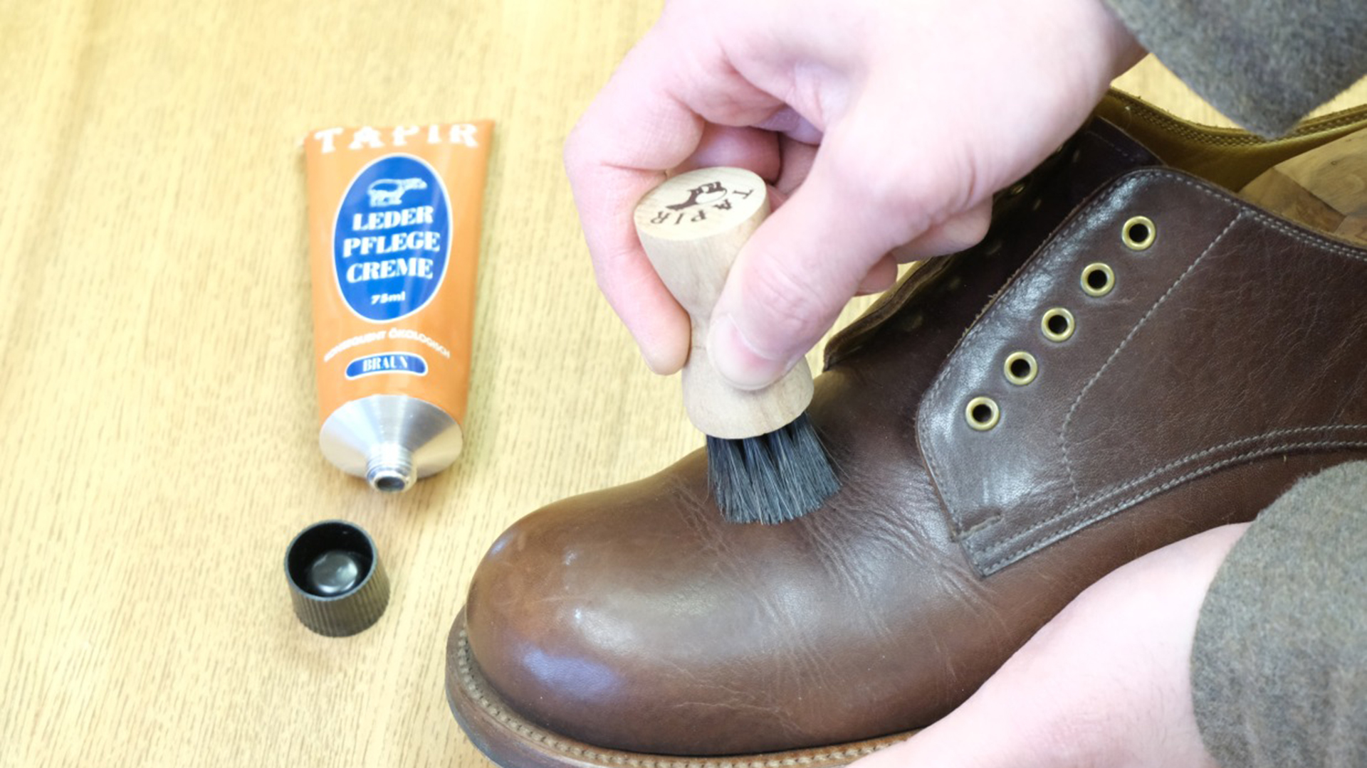 基本は無色のクリームですが、革の表面が擦れたりなどで補色が必要な場合は革の色に近いクリームをお選びください。ブラシはクリームの色によって使い分けると良いです。