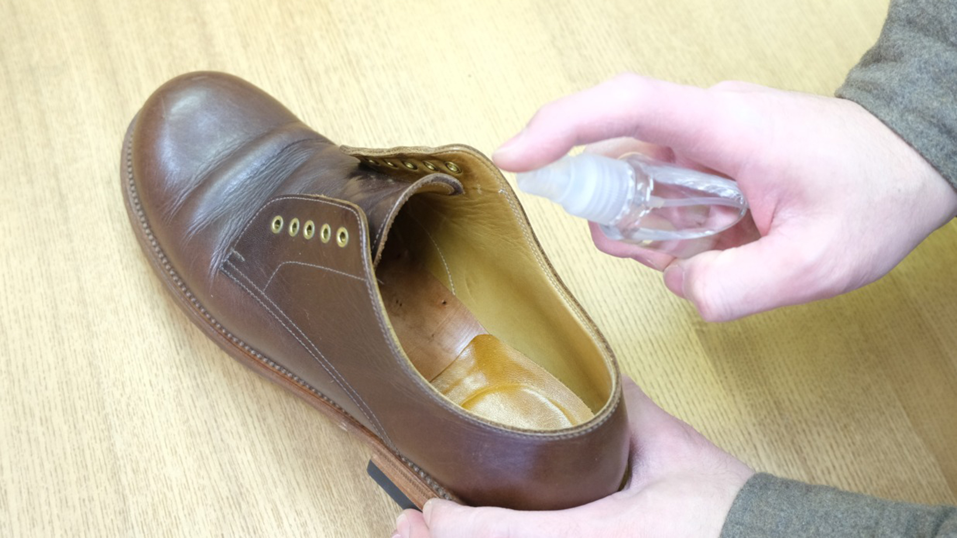 靴ひもをを外し、靴の内部へアルコールスプレーをかけます。除菌をし消臭します。
